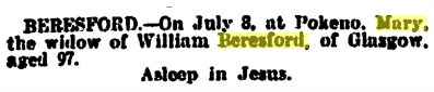 Some time after James Beresford died in 1884, Mary Ann Gibb (nee Beresford) and her husband moved their family to Pokeno, New Zealand and Mary Beresford joined them. She stayed with them for the next 19 years until her death 8 July 1902 aged 87. The death certificate says she was born in Ireland and that her father was J. Hall, a miller. There is a definite DNA connection to Beresford descendants, so if Mary’s father was indeed a J or John Hall, then it’s possible that Mary was a first cousin to John Hall aboard the Thomas Arbuthnot. Though her death certificate lists her as Irish born, her death notice has her correctly as ‘of Glasgow’ though the age at death is misprinted.