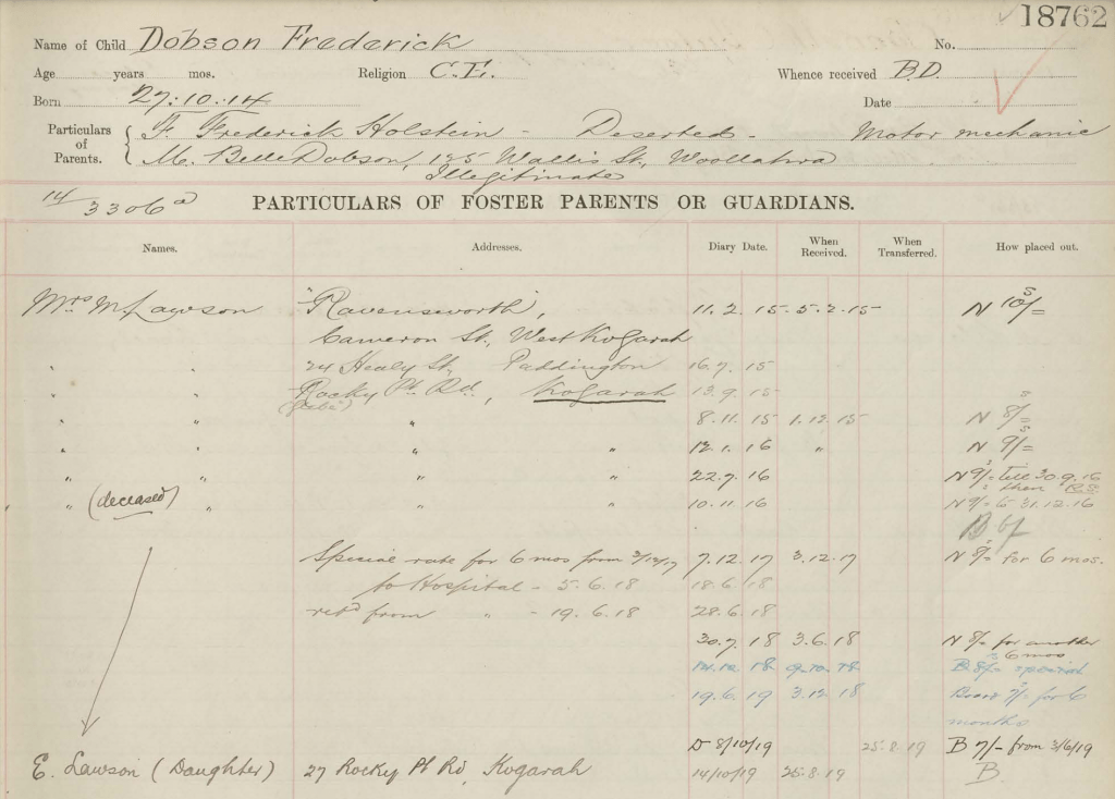 Fred Dobson also has an entry in the NSW Dependent Children Register, which confirms that he was also fostered by Mary Lawson of Kogarah