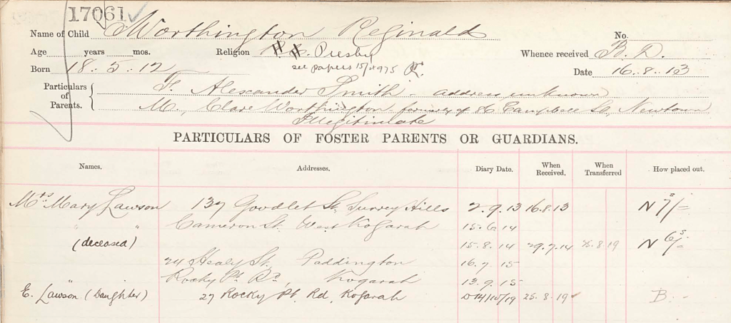 The entry for Reginald Worthington in the NSW Dependent Children Register shows that he was born on 18 February 1912 and fostered to Mrs Mary Lawson of Surry Hills (later of Kogarah) on 16 August 1913, when he was only 18 months old. After Mary Lawson died in 1919, when Reginald was only 7, her daughter Ethel Jane Lawson became his guardian, and she is noted as living at 27 Rocky Point Road in that year. Ethel died in 1929 aged 42 and her sister Jessie appears at the address from the following year.