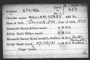 Soon after Elsie’s death William Kyling seems to have enlisted as a merchant seaman in the First World War. Though I haven’t been able to locate his enlistment papers, the National Archives in London holds a medal card for him: