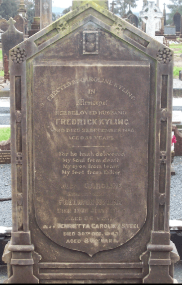 Headstone inscription: Erected by Caroline Kyling in memory of her beloved husband Frederick Kyling who died on 23 December 1886 aged 54 years. For he hath delivered my soul from death, my eyes from tears, my feet from falling. Also Caroline, beloved wife of Frederick Kyling, died 19 July 1906 aged 66 years. Also Henrietta Caroline Steele died 30 December 1943 aged 80 years.