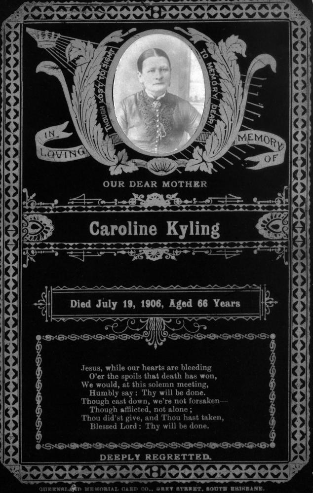 | 5. Christian William Harry KYLING | b. 7 Sep 1866 Qld ; d. 18 Jun 1904 Qld ; buried Warwick, Qld ; m. 25 Sep 1889 Qld – Jane ECKHARDT (b. 1869 ; d. 1941 Qld ; buried 10 Oct 1941 Toowong Cemetery, Brisbane, Qld) – 3 children Displaced Relics of Henry Kyling |