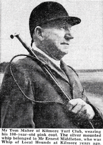 Mr Maher is proud of his pink coat, which he thinks must be 100 years old. It was given to him by Mr Ernest Middleton, who was the Whip of Local Hounds in the days when Kilmore had a hunt club, before the turn of the century.