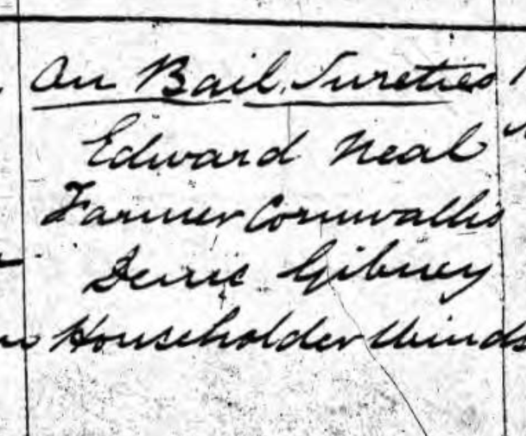 In 1842, Catherine and John’s youngest boy, John Warrington, was charged with two others for assault .. ‘but upon their promising to keep the peace, and pay expenses, they were discharged’. One of the people listed in the court document as having provided bail sureties for him was ‘Edward Neal, farmer, Cornwallis’.