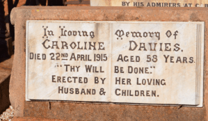 On Thursday morning last, after an illness of about eight weeks, the death occurred at her residence, Green street, Cobar, of Mrs Caroline Davies, wife of Mr John Davies, and. one of the oldest residents of the district.