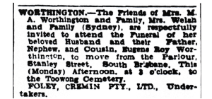 d. 14 Apr 1934 Brisbane, Qld ; buried 16 Apr 1934 Toowong Cemetery, Brisbane, Qld