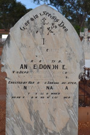 In loving memory of our dear mother, Annie Donohoe, who departed this life at Cobar May 30th 1908 aged 84 years. Erected by her loving son and daughter, Henry and Annabella. |